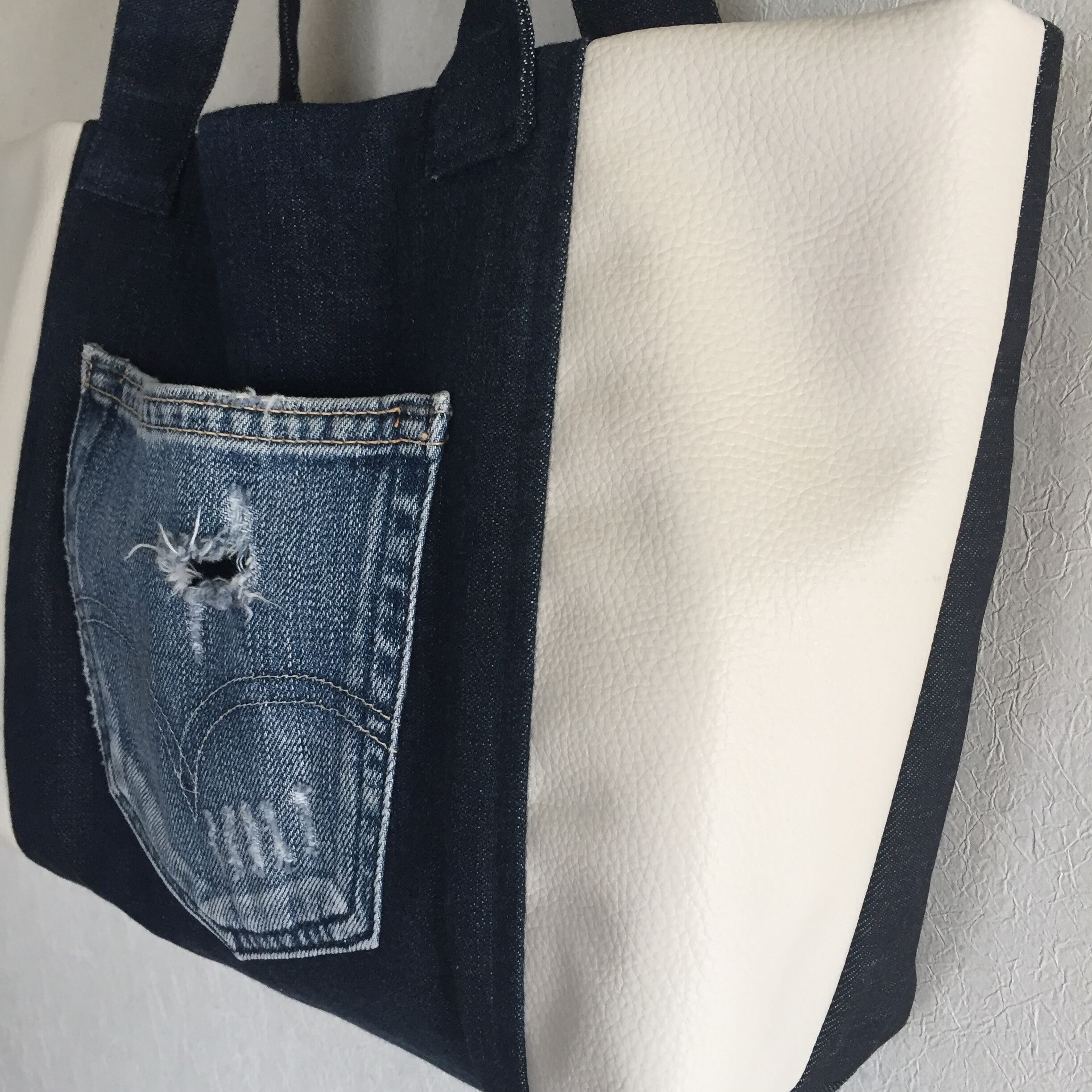 デニムに合皮生地を合わせたデニムリメイクトートバッグ