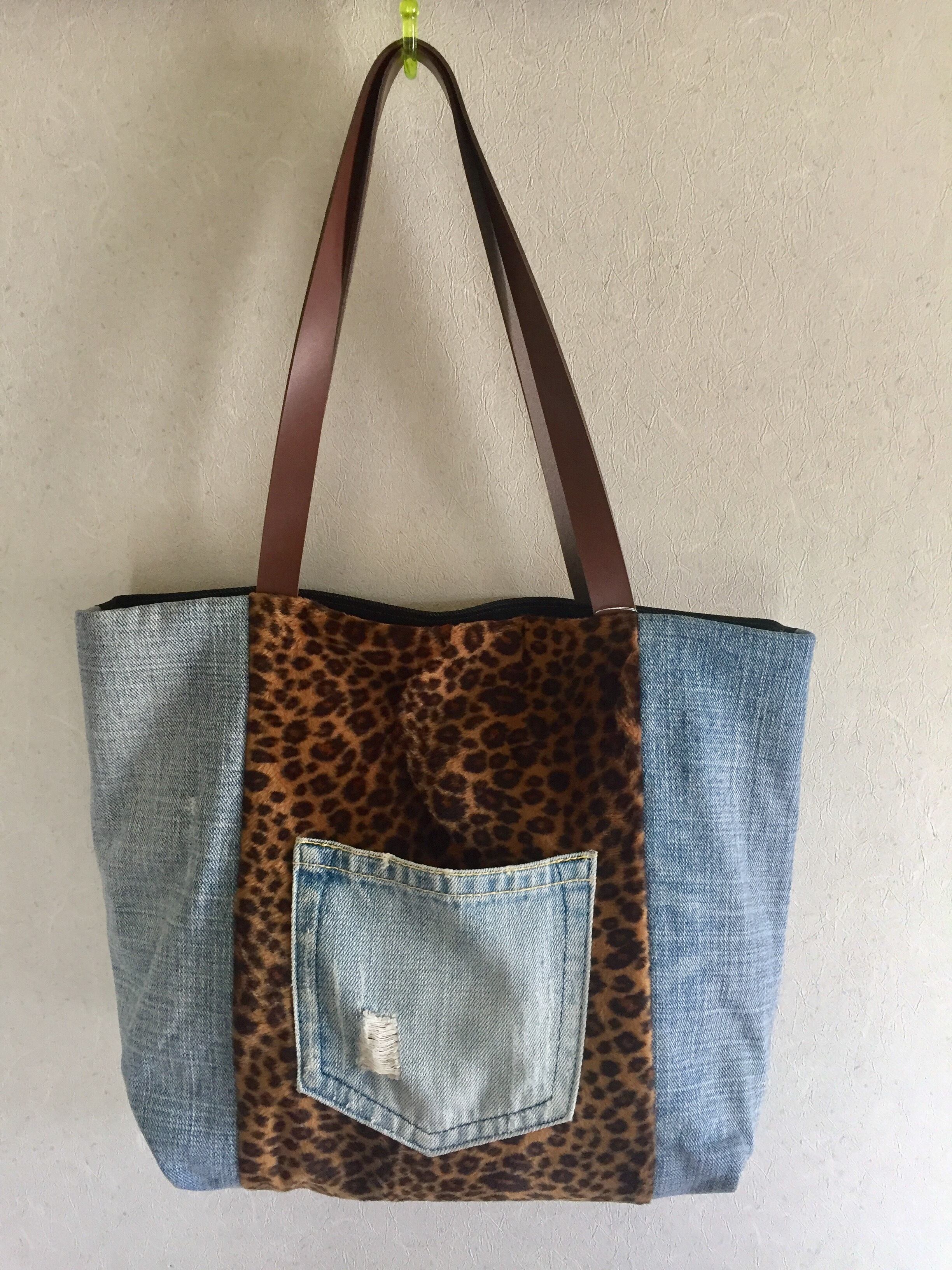 デニムに起毛素材のレオパード生地を合わせたトートバッグ