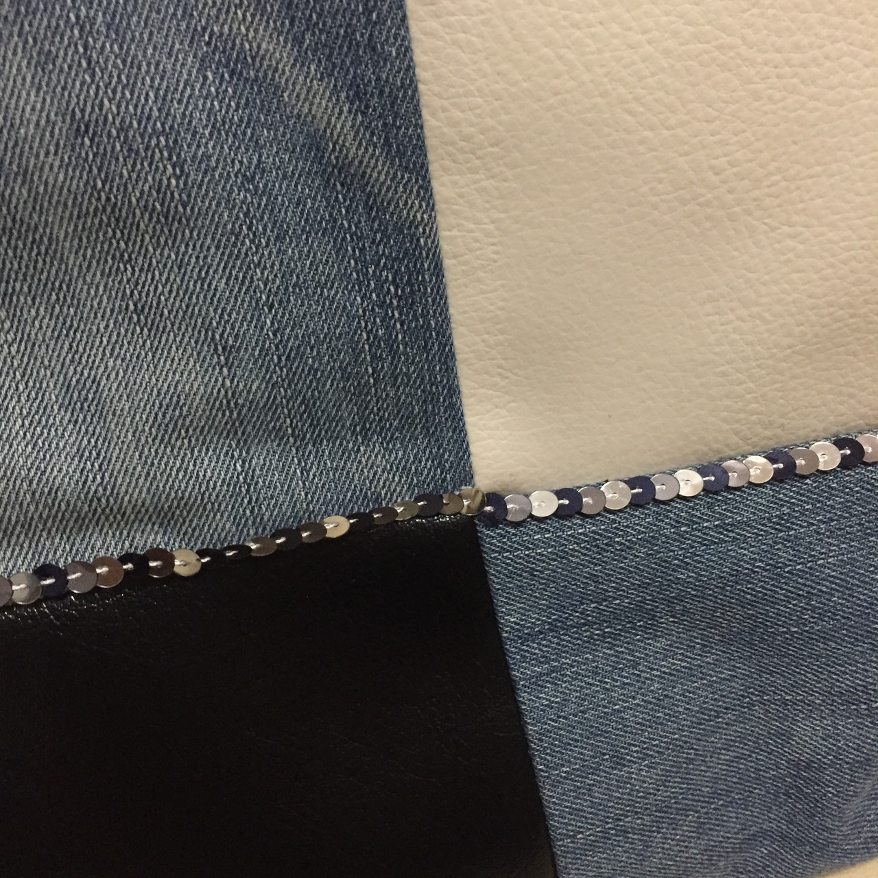 デニムに白と黒の合皮生地、スパンコールを掛け合わせました。クールの中にもキラキラと女性らしいバッグに仕上げました♪